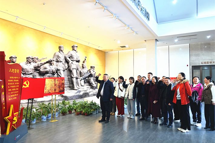在平江起义纪念馆,党支部书记邝祝芳带领全体党员面向党旗庄严重温入党誓词。在讲解员引领下,党员们依次参观了“举义平江城”“转战湘鄂赣”“会师井冈山”等主题展区,通过实物展示、影像资料和场景复原,深入学习彭德怀、滕代远等老一辈革命家密切联系群众、英勇顽强奋斗的光辉革命历程。大家驻足凝视、轻声交流,深刻感悟“对党忠诚、无私奉献、英勇果敢、不怕牺牲”的平江起义精神。随后,全体人员赴湘鄂赣革命根据地纪念馆,通过系统的现场教学,进一步明晰了湘鄂赣边区革命斗争的历史意义。